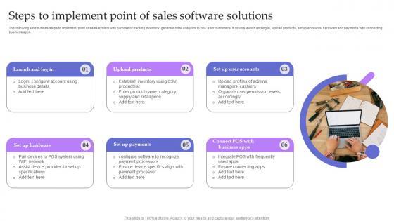 The following slide outlines steps to implement point of sales system with purpose of tracking inventory, generate retail analytics to look after customers. It covers launch and log in, upload products, set up accounts, hardware and payments with connecting business apps. Pitch your topic with ease and precision using this Steps To Implement Point Of Sales Software Solutions Formats Pdf. This layout presents information on Upload Products, Set Up Hardware, Connect POS Business Apps. It is also available for immediate download and adjustment. So, changes can be made in the color, design, graphics or any other component to create a unique layout. The following slide outlines steps to implement point of sales system with purpose of tracking inventory, generate retail analytics to look after customers. It covers launch and log in, upload products, set up accounts, hardware and payments with connecting business apps.