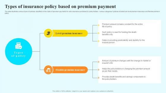 The slide illustrates various types of policies classified on the basis of premium payments for auto insurance purchased by policyholders. Various categories f policies included are level-premium insurance and flexible-premium policy. Welcome to our selection of the Types Of Insurance Policy Based Steps By Step Guide For Claiming Car PPT Sample. These are designed to help you showcase your creativity and bring your sphere to life. Planning and Innovation are essential for any business that is just starting out. This collection contains the designs that you need for your everyday presentations. All of our PowerPoints are 100Percent editable, so you can customize them to suit your needs. This multi-purpose template can be used in various situations. Grab these presentation templates today. The slide illustrates various types of policies classified on the basis of premium payments for auto insurance purchased by policyholders. Various categories f policies included are level-premium insurance and flexible-premium policy.
