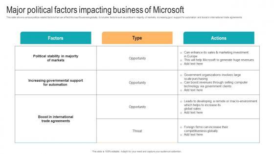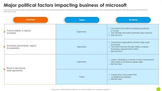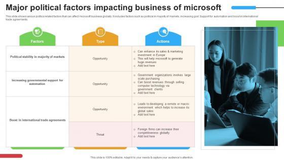 This slide shows various politics related factors that can affect Microsoft business globally. It includes factors such as political in majority of markets, increasing govt. support for automation and boost in international trade agreements. Welcome to our selection of the Major Political Factors Impacting Business Of Strategic Advancements By Microsofts Pictures Pdf. These are designed to help you showcase your creativity and bring your sphere to life. Planning and Innovation are essential for any business that is just starting out. This collection contains the designs that you need for your everyday presentations. All of our PowerPoints are 100 percent editable, so you can customize them to suit your needs. This multi-purpose template can be used in various situations. Grab these presentation templates today This slide shows various politics related factors that can affect Microsoft business globally. It includes factors such as political in majority of markets, increasing govt. support for automation and boost in international trade agreements.