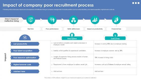 Following slide showcases impact and consequences of ineffective hiring on company management. It include pointers such as lost productivity, poor talent acquisition, high turnover costs etc. If your project calls for a presentation, then Slidegeeks is your go-to partner because we have professionally designed, easy-to-edit templates that are perfect for any presentation. After downloading, you can easily edit Integrating Automation For Effective Business Impact Of Company Poor Recruitment Process and make the changes accordingly. You can rearrange slides or fill them with different images. Check out all the handy templates Following slide showcases impact and consequences of ineffective hiring on company management. It include pointers such as lost productivity, poor talent acquisition, high turnover costs etc.