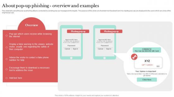 This slide talks about the pop-up phishing attacks conducted by sending pop-up messages to the targets. The purpose of this slide is to illustrate how fraudulent and mis-leading pop-ups are displayed to the users which are clone of the original pop-ups. From laying roadmaps to briefing everything in detail, our templates are perfect for you. You can set the stage with your presentation slides. All you have to do is download these easy-to-edit and customizable templates. About Pop Up Phishing Overview And Examples Man In The Middle Phishing IT will help you deliver an outstanding performance that everyone would remember and praise you for. Do download this presentation today. This slide talks about the pop-up phishing attacks conducted by sending pop-up messages to the targets. The purpose of this slide is to illustrate how fraudulent and mis-leading pop-ups are displayed to the users which are clone of the original pop-ups.
