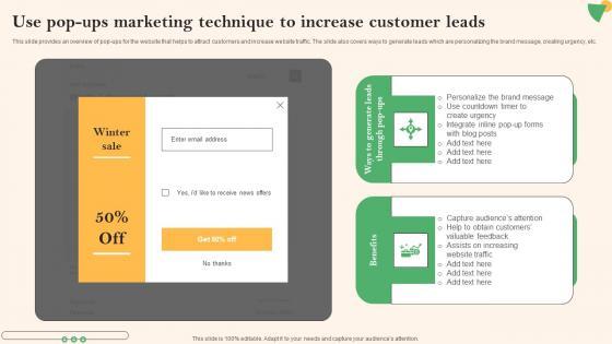 This slide provides an overview of pop-ups for the website that helps to attract customers and increase website traffic. The slide also covers ways to generate leads which are personalizing the brand message, creating urgency, etc. Whether you have daily or monthly meetings, a brilliant presentation is necessary. Call To Action Marketing Techniques Use Pop Ups Marketing Technique To Increase Designs PDF can be your best option for delivering a presentation. Represent everything in detail using Call To Action Marketing Techniques Use Pop Ups Marketing Technique To Increase Designs PDF and make yourself stand out in meetings. The template is versatile and follows a structure that will cater to your requirements. All the templates prepared by Slidegeeks are easy to download and edit. Our research experts have taken care of the corporate themes as well. So, give it a try and see the results.