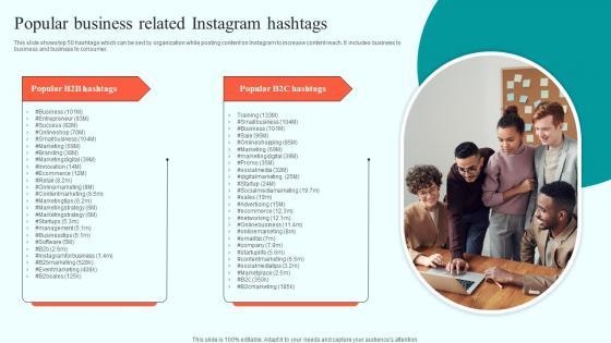 This slide shows top 50 hashtags which can be sed by organization while posting content on Instagram to increase content reach. It includes business to business and business to consumer. The Social Media Marketing To Enhance Popular Business Related Instagram Hashtags MKT SS V is a compilation of the most recent design trends as a series of slides. It is suitable for any subject or industry presentation, containing attractive visuals and photo spots for businesses to clearly express their messages. This template contains a variety of slides for the user to input data, such as structures to contrast two elements, bullet points, and slides for written information. Slidegeeks is prepared to create an impression. This slide shows top 50 hashtags which can be sed by organization while posting content on Instagram to increase content reach. It includes business to business and business to consumer.