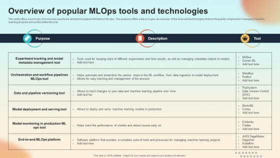 This slide offers a summary of commonly used tools and technologies in the field of MLOps. The purpose of this slide is to give an overview of the tools and technologies that are frequently employed in managing machine learning projects across the entire lifecycle. There are so many reasons you need a Overview Of Popular MLOPs Tools And Technologies Introduction To MLOPs IT. The first reason is you can not spend time making everything from scratch, Thus, Slidegeeks has made presentation templates for you too. You can easily download these templates from our website easily. This slide offers a summary of commonly used tools and technologies in the field of MLOps. The purpose of this slide is to give an overview of the tools and technologies that are frequently employed in managing machine learning projects across the entire lifecycle