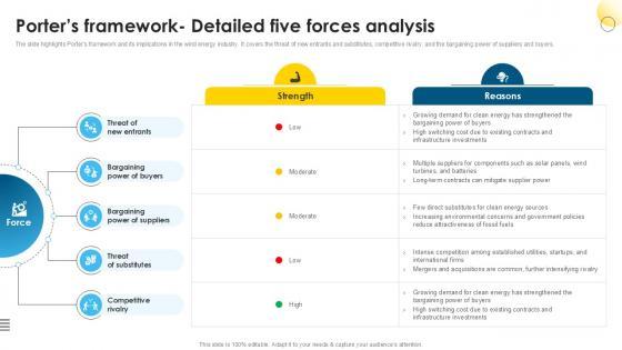 The slide highlights Porters framework and its implications in the wind energy industry. It covers the threat of new entrants and substitutes, competitive rivalry, and the bargaining power of suppliers and buyers. The Porters Framework- Detailed Global Wind Power Market PPT PowerPoint IR SS V is a compilation of the most recent design trends as a series of slides. It is suitable for any subject or industry presentation, containing attractive visuals and photo spots for businesses to clearly express their messages. This template contains a variety of slides for the user to input data, such as structures to contrast two elements, bullet points, and slides for written information. Slidegeeks is prepared to create an impression. The slide highlights Porters framework and its implications in the wind energy industry. It covers the threat of new entrants and substitutes, competitive rivalry, and the bargaining power of suppliers and buyers.