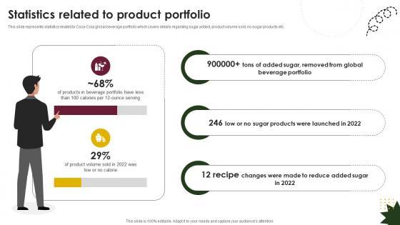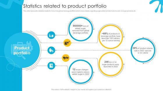 This slide represents statistics related to Coca-Cola global beverage portfolio which covers details regarding sugar added, product volume sold, no sugar products etc.This modern and well-arranged Statistics Related To Product Portfolio Beverage Company Profile CP SS V provides lots of creative possibilities. It is very simple to customize and edit with the Powerpoint Software. Just drag and drop your pictures into the shapes. All facets of this template can be edited with Powerpoint, no extra software is necessary. Add your own material, put your images in the places assigned for them, adjust the colors, and then you can show your slides to the world, with an animated slide included. This slide represents statistics related to Coca-Cola global beverage portfolio which covers details regarding sugar added, product volume sold, no sugar products etc.