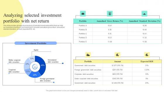 This slide provides glimpse about analysis of selected investment portfolio that can help our business in tracking of our investment. It includes annualized gross return, annualized standard deviation, amount, expected ROI, etc. Slidegeeks is here to make your presentations a breeze with Strategic Financial Planning And Administration Analyzing Selected Investment Portfolio Structure PDF With our easy-to-use and customizable templates, you can focus on delivering your ideas rather than worrying about formatting. With a variety of designs to choose from, you are sure to find one that suits your needs. And with animations and unique photos, illustrations, and fonts, you can make your presentation pop. So whether you are giving a sales pitch or presenting to the board, make sure to check out Slidegeeks first This slide provides glimpse about analysis of selected investment portfolio that can help our business in tracking of our investment. It includes annualized gross return, annualized standard deviation, amount, expected ROI, etc.