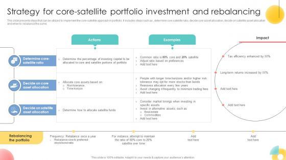 This slide presents steps that can be utilized to implement the core-satellite approach in portfolio. It includes steps such as , determine core satellite ratio, decide core asset allocation, decide on satellite asset allocation and when to rebalance the same.Make sure to capture your audiences attention in your business displays with our gratis customizable Strategy For Core Satellite Portfolio Investment And Strategic Investment Plan For Optimizing Risk SS V. These are great for business strategies, office conferences, capital raising or task suggestions. If you desire to acquire more customers for your tech business and ensure they stay satisfied, create your own sales presentation with these plain slides. This slide presents steps that can be utilized to implement the core-satellite approach in portfolio. It includes steps such as , determine core satellite ratio, decide core asset allocation, decide on satellite asset allocation and when to rebalance the same.