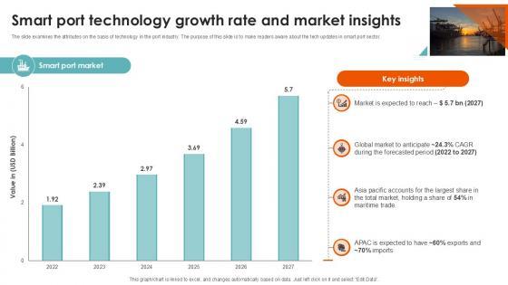 The slide examines the attributes on the basis of technology in the port industry. The purpose of this slide is to make readers aware about the tech updates in smart port sector. Create an editable Smart Port Technology Growth Port Terminal Industry Ppt Presentation that communicates your idea and engages your audience. Whether you are presenting a business or an educational presentation, pre designed presentation templates help save time. Smart Port Technology Growth Port Terminal Industry Ppt Presentation is highly customizable and very easy to edit, covering many different styles from creative to business presentations. Slidegeeks has creative team members who have crafted amazing templates. So, go and get them without any delay. The slide examines the attributes on the basis of technology in the port industry. The purpose of this slide is to make readers aware about the tech updates in smart port sector.