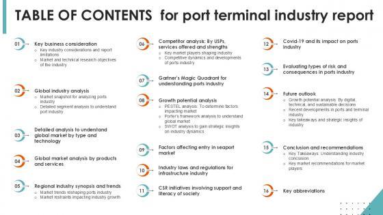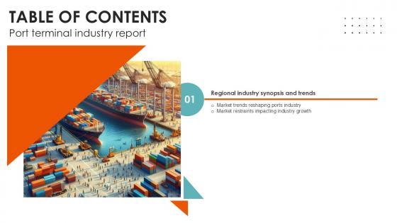 Do you have to make sure that everyone on your team knows about any specific topic I yes, then you should give Table Of Contents Port Terminal Industry Report Ppt Example a try. Our experts have put a lot of knowledge and effort into creating this impeccable Table Of Contents Port Terminal Industry Report Ppt Example . You can use this template for your upcoming presentations, as the slides are perfect to represent even the tiniest detail. You can download these templates from the Slidegeeks website and these are easy to edit. So grab these today Our Table Of Contents Port Terminal Industry Report Ppt Example are topically designed to provide an attractive backdrop to any subject. Use them to look like a presentation pro.