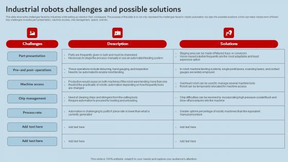 This slide shows the challenges faced by industries while setting up robots in their workspace. The purpose of this slide is to not only represent the challenges faced in robotic automation but also the possible solutions which can make robots more efficient. Key challenges includes part presentation, machine access, chip management, space, cost etc. This modern and well-arranged Industrial Robots Challenges And Possible Applications Of Industrial Robots Elements Pdf provides lots of creative possibilities. It is very simple to customize and edit with the Powerpoint Software. Just drag and drop your pictures into the shapes. All facets of this template can be edited with Powerpoint, no extra software is necessary. Add your own material, put your images in the places assigned for them, adjust the colors, and then you can show your slides to the world, with an animated slide included. This slide shows the challenges faced by industries while setting up robots in their workspace. The purpose of this slide is to not only represent the challenges faced in robotic automation but also the possible solutions which can make robots more efficient. Key challenges includes part presentation, machine access, chip management, space, cost etc.