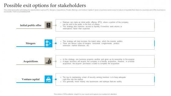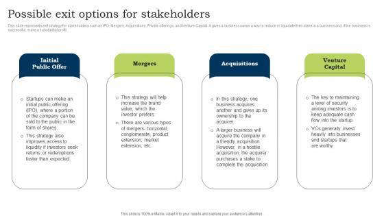 This slide represents exit strategy for stakeholders such as IPO, Mergers, Acquisitions, Private offerings, and Venture Capital. It gives a business owner a way to reduce or liquidate their stake in a business and, if the business is successful, make a substantial profit. Slidegeeks is one of the best resources for PowerPoint templates. You can download easily and regulate Exit Strategies And Its Implementation In Banking Industry Possible Exit Options Information PDF for your personal presentations from our wonderful collection. A few clicks is all it takes to discover and get the most relevant and appropriate templates. Use our Templates to add a unique zing and appeal to your presentation and meetings. All the slides are easy to edit and you can use them even for advertisement purposes.