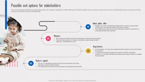 This slide represents exit strategy for stakeholders such as IPO, Mergers, Acquisitions, Private offerings, and Venture Capital. It gives a business owner a way to reduce or liquidate their stake in a business and, if the business is successful, make a substantial profit. Slidegeeks is one of the best resources for PowerPoint templates. You can download easily and regulate Possible Exit Options For Stakeholders Exit Strategy And Its Need In Daycare Industry Portrait Pdf for your personal presentations from our wonderful collection. A few clicks is all it takes to discover and get the most relevant and appropriate templates. Use our Templates to add a unique zing and appeal to your presentation and meetings. All the slides are easy to edit and you can use them even for advertisement purposes. This slide represents exit strategy for stakeholders such as IPO, Mergers, Acquisitions, Private offerings, and Venture Capital. It gives a business owner a way to reduce or liquidate their stake in a business and, if the business is successful, make a substantial profit.