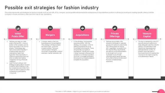 This slide represents exit strategies for fashion industry such as sell-offs, IPOs, mergers, and acquisitions that enable the entrepreneur to liquidate their position in a financial asset upon meeting specific criteria, limit the companys losses, and take a step back from day-to-day operations. Presenting this PowerPoint presentation, titled Possible Exit Strategies For Fashion Industry Boutique Business Pictures Pdf, with topics curated by our researchers after extensive research. This editable presentation is available for immediate download and provides attractive features when used. Download now and captivate your audience. Presenting this Possible Exit Strategies For Fashion Industry Boutique Business Pictures Pdf. Our researchers have carefully researched and created these slides with all aspects taken into consideration. This is a completely customizable Possible Exit Strategies For Fashion Industry Boutique Business Pictures Pdf that is available for immediate downloading. Download now and make an impact on your audience. Highlight the attractive features available with our PPTs. This slide represents exit strategies for fashion industry such as sell-offs, IPOs, mergers, and acquisitions that enable the entrepreneur to liquidate their position in a financial asset upon meeting specific criteria, limit the companys losses, and take a step back from day-to-day operations.