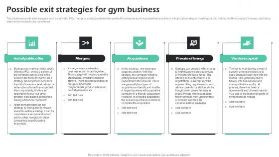 This slide represents exit strategies such as sell-offs, IPOs, mergers, and acquisitions that enable the entrepreneur to liquidate their position in a financial asset upon meeting specific criteria, limit the companys losses, and take a step back from day-to-day operations. Here you can discover an assortment of the finest PowerPoint and Google Slides templates. With these templates, you can create presentations for a variety of purposes while simultaneously providing your audience with an eye-catching visual experience. Download Possible Exit Strategies For Gym Business Fitness Center Business Plan Information Pdf to deliver an impeccable presentation. These templates will make your job of preparing presentations much quicker, yet still, maintain a high level of quality. Slidegeeks has experienced researchers who prepare these templates and write high-quality content for you. Later on, you can personalize the content by editing the Possible Exit Strategies For Gym Business Fitness Center Business Plan Information Pdf This slide represents exit strategies such as sell-offs, IPOs, mergers, and acquisitions that enable the entrepreneur to liquidate their position in a financial asset upon meeting specific criteria, limit the companys losses, and take a step back from day-to-day operations.