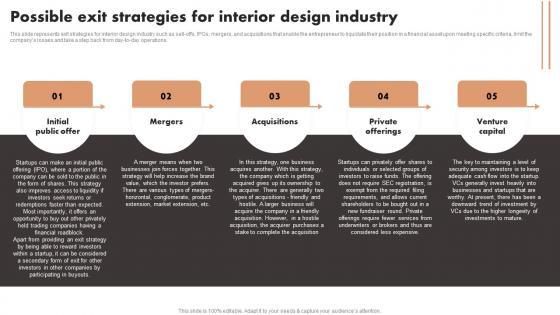This slide represents exit strategies for interior design industry such as sell-offs, IPOs, mergers, and acquisitions that enable the entrepreneur to liquidate their position in a financial asset upon meeting specific criteria, limit the companys losses,and take a step back from day-to-day operations. Do you have to make sure that everyone on your team knows about any specific topic I yes, then you should give Possible Exit Strategies For Interior Design Industry Luxury Interior Design Icons Pdf a try. Our experts have put a lot of knowledge and effort into creating this impeccable Possible Exit Strategies For Interior Design Industry Luxury Interior Design Icons Pdf You can use this template for your upcoming presentations, as the slides are perfect to represent even the tiniest detail. You can download these templates from the Slidegeeks website and these are easy to edit. So grab these today. This slide represents exit strategies for interior design industry such as sell-offs, IPOs, mergers, and acquisitions that enable the entrepreneur to liquidate their position in a financial asset upon meeting specific criteria, limit the companys losses,and take a step back from day-to-day operations.