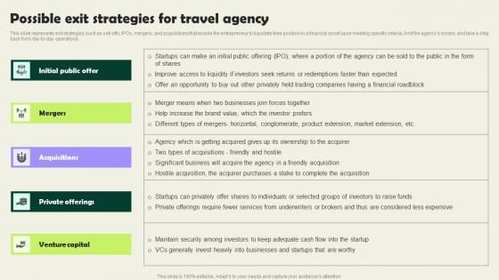 This slide represents exit strategies such as sell-offs, IPOs, mergers, and acquisitions that enable the entrepreneur to liquidate their position in a financial asset upon meeting specific criteria, limit the agencys losses, and take a step back from day-to-day operations.The best PPT templates are a great way to save time, energy, and resources. Slidegeeks have 100Precent editable powerpoint slides making them incredibly versatile. With these quality presentation templates, you can create a captivating and memorable presentation by combining visually appealing slides and effectively communicating your message. Download Possible Exit Strategies For Travel Agency Cultural Travel Agency Business Plan Template Pdf from Slidegeeks and deliver a wonderful presentation. This slide represents exit strategies such as sell offs, IPOs, mergers, and acquisitions that enable the entrepreneur to liquidate their position in a financial asset upon meeting specific criteria, limit the agencys losses, and take a step back from day to day operations.