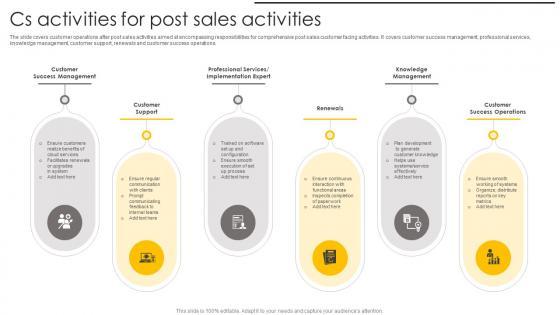 The slide covers customer operations after post sales activities aimed at encompassing responsibilities for comprehensive post sales customer facing activities. It covers customer success management, professional services, knowledge management, customer support, renewals and customer success operations. Showcasing this set of slides titled Cs Activities For Post Sales Activities Slides Pdf. The topics addressed in these templates are Customer Support, Renewals, Knowledge Management . All the content presented in this PPT design is completely editable. Download it and make adjustments in color, background, font etc. as per your unique business setting. The slide covers customer operations after post sales activities aimed at encompassing responsibilities for comprehensive post sales customer facing activities. It covers customer success management, professional services, knowledge management, customer support, renewals and customer success operations.