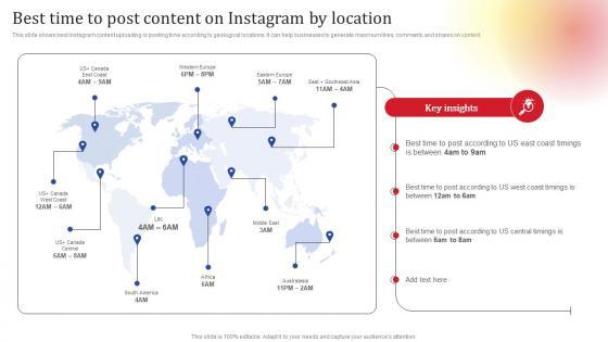 This slide shows best Instagram content uploading or posting time according to geological locations. It can help businesses to generate maximum likes, comments and shares on content. Do you have to make sure that everyone on your team knows about any specific topic I yes, then you should give Best Time To Post Content On Social Media Platform Advertising To Enhance Brand Awareness Template Pdf a try. Our experts have put a lot of knowledge and effort into creating this impeccable Best Time To Post Content On Social Media Platform Advertising To Enhance Brand Awareness Template Pdf. You can use this template for your upcoming presentations, as the slides are perfect to represent even the tiniest detail. You can download these templates from the Slidegeeks website and these are easy to edit. So grab these today This slide shows best Instagram content uploading or posting time according to geological locations. It can help businesses to generate maximum likes, comments and shares on content.