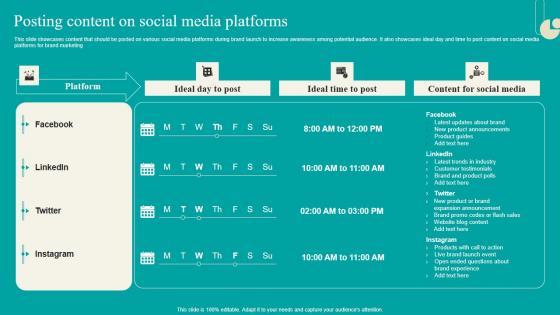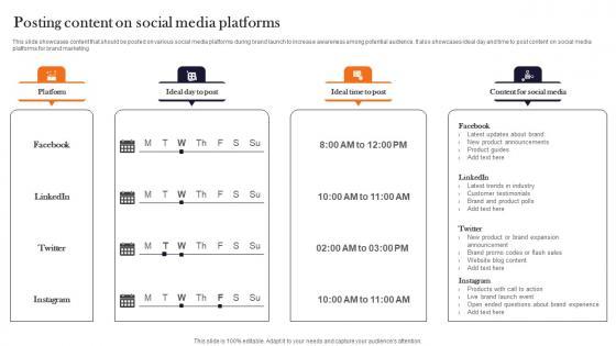 This slide showcases content that should be posted on various social media platforms during brand launch to increase awareness among potential audience. It also showcases ideal day and time to post content on social media platforms for brand marketing Want to ace your presentation in front of a live audience Our Posting Content On Social Media Platforms Launching New Product Brand Themes Pdf can help you do that by engaging all the users towards you. Slidegeeks experts have put their efforts and expertise into creating these impeccable powerpoint presentations so that you can communicate your ideas clearly. Moreover, all the templates are customizable, and easy-to-edit and downloadable. Use these for both personal and commercial use. This slide showcases content that should be posted on various social media platforms during brand launch to increase awareness among potential audience. It also showcases ideal day and time to post content on social media platforms for brand marketing