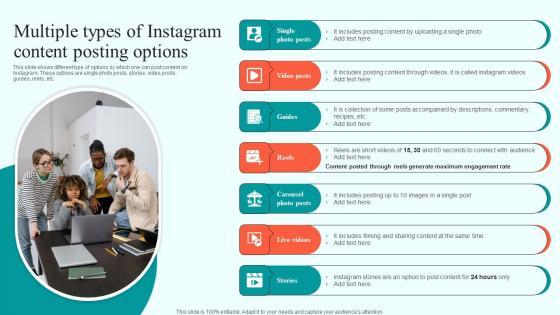 This slide shows different type of options by which one can post content on Instagram. These options are single photo posts, stories , video posts, guides, reels, etc. The best PPT templates are a great way to save time, energy, and resources. Slidegeeks have 100 percent editable powerpoint slides making them incredibly versatile. With these quality presentation templates, you can create a captivating and memorable presentation by combining visually appealing slides and effectively communicating your message. Download Multiple Types Of Instagram Content Posting Online Advertising Solutions Information Pdf from Slidegeeks and deliver a wonderful presentation. This slide shows different type of options by which one can post content on Instagram. These options are single photo posts, stories , video posts, guides, reels, etc.