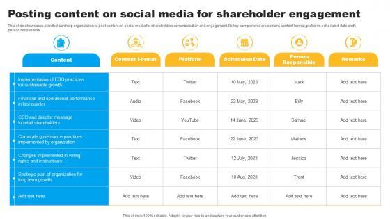 This slide showcases plan that can help organization to post content on social media for shareholders communication and engagement. Its key components are content, content format, platform, scheduled date and person responsible. Formulating a presentation can take up a lot of effort and time, so the content and message should always be the primary focus. The visuals of the PowerPoint can enhance the presenters message, so our Strategies To Maintain Effective Relationships Posting Content On Social Media Information Pdf was created to help save time. Instead of worrying about the design, the presenter can concentrate on the message while our designers work on creating the ideal templates for whatever situation is needed. Slidegeeks has experts for everything from amazing designs to valuable content, we have put everything into Strategies To Maintain Effective Relationships Posting Content On Social Media Information Pdf This slide showcases plan that can help organization to post content on social media for shareholders communication and engagement. Its key components are content, content format, platform, scheduled date and person responsible.