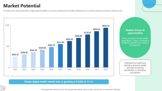 This slide covers market opportunities of digital healthcare platforms. It involves emerging trends of artificial intelligence such as machine learning and electronic medical records. Here you can discover an assortment of the finest PowerPoint and Google Slides templates. With these templates, you can create presentations for a variety of purposes while simultaneously providing your audience with an eye-catching visual experience. Download Market Potential Medical Benefits Navigation Platform Pitch Deck Ppt Sample to deliver an impeccable presentation. These templates will make your job of preparing presentations much quicker, yet still, maintain a high level of quality. Slidegeeks has experienced researchers who prepare these templates and write high-quality content for you. Later on, you can personalize the content by editing the Market Potential Medical Benefits Navigation Platform Pitch Deck Ppt Sample. This slide covers market opportunities of digital healthcare platforms. It involves emerging trends of artificial intelligence such as machine learning and electronic medical records.