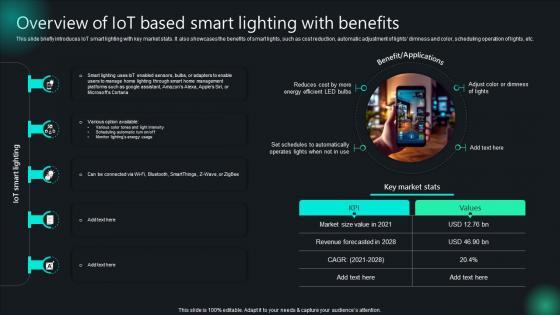 This slide briefly introduces IoT smart lighting with key market stats. It also showcases the benefits of smart lights, such as cost reduction, automatic adjustment of lights dimness and color, scheduling operation of lights, etc. Do you have to make sure that everyone on your team knows about any specific topic I yes, then you should give Overview Of IoT Based Smart Lighting With Benefits Unlocking Potential IoTs Application IoT SS V a try. Our experts have put a lot of knowledge and effort into creating this impeccable Overview Of IoT Based Smart Lighting With Benefits Unlocking Potential IoTs Application IoT SS V. You can use this template for your upcoming presentations, as the slides are perfect to represent even the tiniest detail. You can download these templates from the Slidegeeks website and these are easy to edit. So grab these today This slide briefly introduces IoT smart lighting with key market stats. It also showcases the benefits of smart lights, such as cost reduction, automatic adjustment of lights dimness and color, scheduling operation of lights, etc.