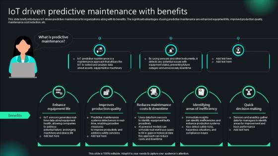 This slide briefly introduces IoT-driven predictive maintenance for organizations along with its benefits. The significant advantages of using predictive maintenance are enhanced equipment life, improved production quality, maintenance cost reduction, etc. Presenting this PowerPoint presentation, titled Unlocking Potential IoTs Application IoT Driven Predictive Maintenance With Benefits IoT SS V, with topics curated by our researchers after extensive research. This editable presentation is available for immediate download and provides attractive features when used. Download now and captivate your audience. Presenting this Unlocking Potential IoTs Application IoT Driven Predictive Maintenance With Benefits IoT SS V. Our researchers have carefully researched and created these slides with all aspects taken into consideration. This is a completely customizable Unlocking Potential IoTs Application IoT Driven Predictive Maintenance With Benefits IoT SS V that is available for immediate downloading. Download now and make an impact on your audience. Highlight the attractive features available with our PPTs. This slide briefly introduces IoT-driven predictive maintenance for organizations along with its benefits. The significant advantages of using predictive maintenance are enhanced equipment life, improved production quality, maintenance cost reduction, etc.