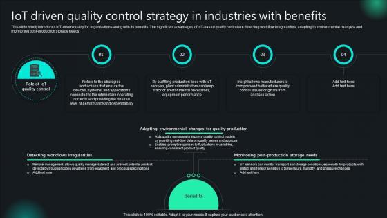 This slide briefly introduces IoT-driven quality for organizations along with its benefits. The significant advantages of IoT-based quality control are detecting workflow irregularities, adapting to environmental changes, and monitoring post-production storage needs. Here you can discover an assortment of the finest PowerPoint and Google Slides templates. With these templates, you can create presentations for a variety of purposes while simultaneously providing your audience with an eye-catching visual experience. Download Unlocking Potential IoTs Application IoT Driven Quality Control Strategy In Industries With Benefits IoT SS V to deliver an impeccable presentation. These templates will make your job of preparing presentations much quicker, yet still, maintain a high level of quality. Slidegeeks has experienced researchers who prepare these templates and write high-quality content for you. Later on, you can personalize the content by editing the Unlocking Potential IoTs Application IoT Driven Quality Control Strategy In Industries With Benefits IoT SS V. This slide briefly introduces IoT-driven quality for organizations along with its benefits. The significant advantages of IoT-based quality control are detecting workflow irregularities, adapting to environmental changes, and monitoring post-production storage needs.