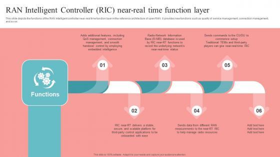 This slide depicts the functions of the RAN intelligent controller near-real time function layer in the reference architecture of open RAN. It provides new functions such as quality of service management, connection management, and so on. This Ran Intelligent Controller RIC Near Real Time Unlocking The Potential Of Open RAN Brochure Pdf is perfect for any presentation, be it in front of clients or colleagues. It is a versatile and stylish solution for organizing your meetings. The Ran Intelligent Controller RIC Near Real Time Unlocking The Potential Of Open RAN Brochure Pdf features a modern design for your presentation meetings. The adjustable and customizable slides provide unlimited possibilities for acing up your presentation. Slidegeeks has done all the homework before launching the product for you. So, do not wait, grab the presentation templates today This slide depicts the functions of the RAN intelligent controller near-real time function layer in the reference architecture of open RAN. It provides new functions such as quality of service management, connection management, and so on.
