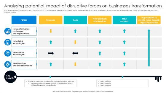 This slide analysis the potential impact of disruptive forces on businesses in the energy and utilities sector. It includes new performance challenges and expectations, new technologies, new energy technologies, new practices and business models. There are so many reasons you need a Analysing Potential Impact Of Digital Transformation Journey PPT Template DT SS V. The first reason is you can not spend time making everything from scratch, Thus, Slidegeeks has made presentation templates for you too. You can easily download these templates from our website easily. This slide analysis the potential impact of disruptive forces on businesses in the energy and utilities sector. It includes new performance challenges and expectations, new technologies, new energy technologies, new practices and business models.