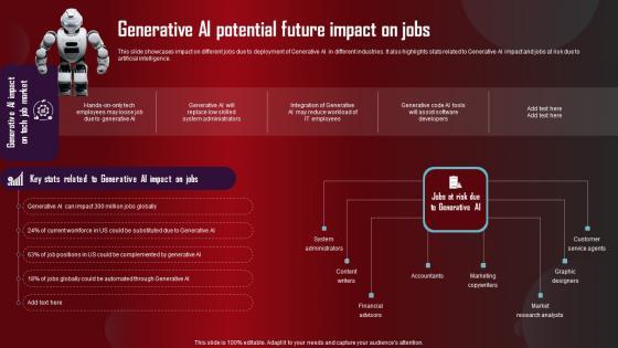 This slide showcases impact on different jobs due to deployment of Generative AI in different industries. It also highlights stats related to Generative AI impact and jobs at risk due to artificial intelligence. This modern and well arranged Generative AI Potential Future Impact Role Of Generative AI Tools Across Information Pdf provides lots of creative possibilities. It is very simple to customize and edit with the Powerpoint Software. Just drag and drop your pictures into the shapes. All facets of this template can be edited with Powerpoint no extra software is necessary. Add your own material, put your images in the places assigned for them, adjust the colors, and then you can show your slides to the world, with an animated slide included. This slide showcases impact on different jobs due to deployment of Generative AI in different industries. It also highlights stats related to Generative AI impact and jobs at risk due to artificial intelligence.
