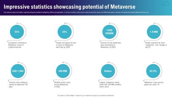 This slide provides information regarding intriguing statistics highlighting Metaverse popularity in terms of monthly active users, amount spend by users over Metaverse space, amount real estate purchased, global searches, etc. Find a pre-designed and impeccable Impressive Statistics Showcasing Potential Continuum Of Technology Revamping Business AI SS V. The templates can ace your presentation without additional effort. You can download these easy-to-edit presentation templates to make your presentation stand out from others. So, what are you waiting for Download the template from Slidegeeks today and give a unique touch to your presentation. This slide provides information regarding intriguing statistics highlighting Metaverse popularity in terms of monthly active users, amount spend by users over Metaverse space, amount real estate purchased, global searches, etc.