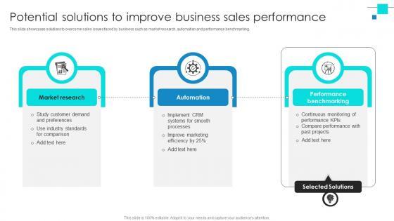 This slide showcases solutions to overcome sales issues faced by business such as market research, automation and performance benchmarking. Find a pre-designed and impeccable Improving Business Marketing Performance Potential Solutions To Improve Business CRP DK SS V. The templates can ace your presentation without additional effort. You can download these easy-to-edit presentation templates to make your presentation stand out from others. So, what are you waiting for Download the template from Slidegeeks today and give a unique touch to your presentation. This slide showcases solutions to overcome sales issues faced by business such as market research, automation and performance benchmarking.