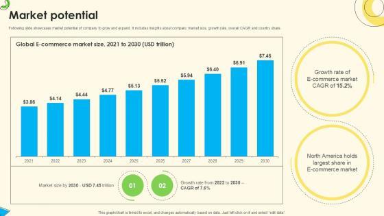 This slide represents esteemed market potential which assists investors to gain idea of growth opportunities of company in global market and make strategic investment decisions. Are you in need of a template that can accommodate all of your creative concepts This one is crafted professionally and can be altered to fit any style. Use it with Google Slides or PowerPoint. Include striking photographs, symbols, depictions, and other visuals. Fill, move around, or remove text boxes as desired. Test out color palettes and font mixtures. Edit and save your work, or work with colleagues. Download Market Potential Beauty Brands And Retailers Company Fund Raising Topics PDF and observe how to make your presentation outstanding. Give an impeccable presentation to your group and make your presentation unforgettable. This slide represents esteemed market potential which assists investors to gain idea of growth opportunities of company in global market and make strategic investment decisions.