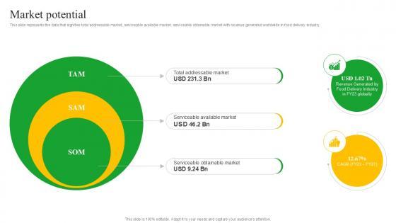 This slide represents the data that signifies total addressable market, serviceable available market, serviceable obtainable market with revenue generated worldwide in food delivery industry. If you are looking for a format to display your unique thoughts, then the professionally designed Market Potential Meal Delivery Service Investor Funding PPT Presentation is the one for you. You can use it as a Google Slides template or a PowerPoint template. Incorporate impressive visuals, symbols, images, and other charts. Modify or reorganize the text boxes as you desire. Experiment with shade schemes and font pairings. Alter, share or cooperate with other people on your work. Download Market Potential Meal Delivery Service Investor Funding PPT Presentation and find out how to give a successful presentation. Present a perfect display to your team and make your presentation unforgettable. This slide represents the data that signifies total addressable market, serviceable available market, serviceable obtainable market with revenue generated worldwide in food delivery industry.