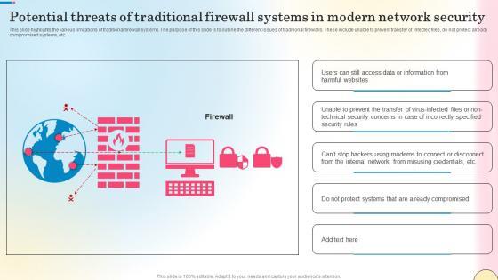 This slide highlights the various limitations of traditional firewall systems. The purpose of this slide is to outline the different issues of traditional firewalls. These include unable to prevent transfer of infected files, do not protect already compromised systems, etc. Create an editable Potential Threats Of Traditional Firewall Systems Security Network Security Portrait Pdf that communicates your idea and engages your audience. Whether you are presenting a business or an educational presentation, pre-designed presentation templates help save time. Potential Threats Of Traditional Firewall Systems Security Network Security Portrait Pdf is highly customizable and very easy to edit, covering many different styles from creative to business presentations. Slidegeeks has creative team members who have crafted amazing templates. So, go and get them without any delay. This slide highlights the various limitations of traditional firewall systems. The purpose of this slide is to outline the different issues of traditional firewalls. These include unable to prevent transfer of infected files, do not protect already compromised systems, etc.