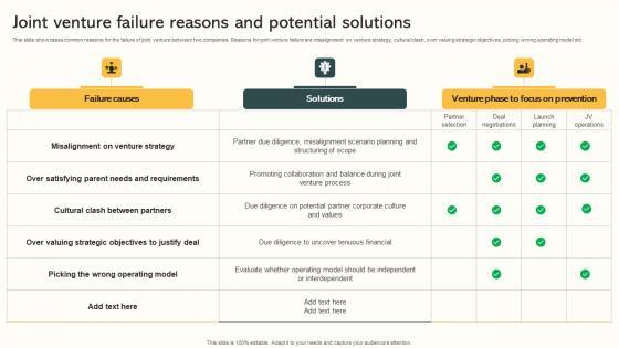 This slide showcases common reasons for the failure of joint venture between two companies. Reasons for joint venture failure are misalignment on venture strategy, cultural clash, over valuing strategic objectives, picking wrong operating model etc. There are so many reasons you need a Joint Venture Failure Reasons And Potential Solutions Market Expansion Through Designs Pdf The first reason is you can not spend time making everything from scratch, Thus, Slidegeeks has made presentation templates for you too. You can easily download these templates from our website easily. This slide showcases common reasons for the failure of joint venture between two companies. Reasons for joint venture failure are misalignment on venture strategy, cultural clash, over valuing strategic objectives, picking wrong operating model etc.