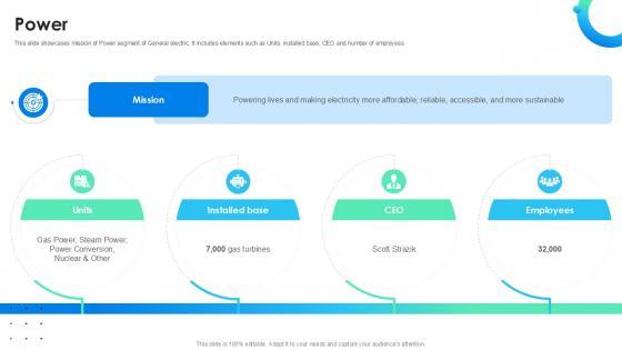 This slide showcases mission of Power segment of General electric. It includes elements such as Units, installed base, CEO and number of employees. Do you know about Slidesgeeks Power Global Energy Company Profile PPT Slide CP SS V These are perfect for delivering any kind od presentation. Using it, create PowerPoint presentations that communicate your ideas and engage audiences. Save time and effort by using our pre-designed presentation templates that are perfect for a wide range of topic. Our vast selection of designs covers a range of styles, from creative to business, and are all highly customizable and easy to edit. Download as a PowerPoint template or use them as Google Slides themes. This slide showcases mission of Power segment of General electric. It includes elements such as Units, installed base, CEO and number of employees.