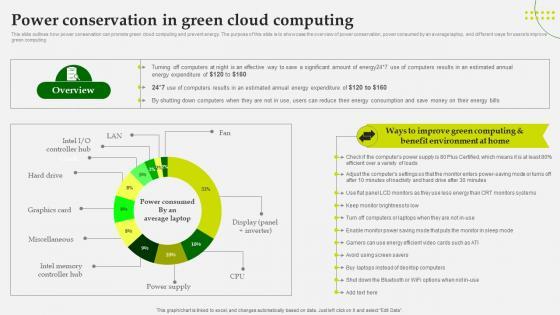 This slide outlines how power conservation can promote green cloud computing and prevent energy. The purpose of this slide is to showcase the overview of power conservation, power consumed by an average laptop, and different ways for users to improve green computing. Do you have an important presentation coming up Are you looking for something that will make your presentation stand out from the rest Look no further than Sustainable Power Conservation In Green Cloud Computing. With our professional designs, you can trust that your presentation will pop and make delivering it a smooth process. And with Slidegeeks, you can trust that your presentation will be unique and memorable. So why wait Grab Sustainable Power Conservation In Green Cloud Computing today and make your presentation stand out from the rest This slide outlines how power conservation can promote green cloud computing and prevent energy. The purpose of this slide is to showcase the overview of power conservation, power consumed by an average laptop, and different ways for users to improve green computing.