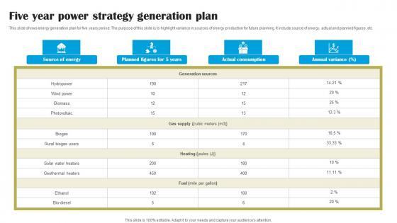 This slide shows core phases of detailed energy plan. The purpose of this slide is to highlight essential phases for framing energy plan. It include phases such as create energy foundation, energy analysis and prepare action plan, etc.Pitch your topic with ease and precision using this Five Year Power Strategy Generation Plan Diagrams Pdf This layout presents information on Actual Consumption, Annual Variance, Geothermal Heaters It is also available for immediate download and adjustment. So, changes can be made in the color, design, graphics or any other component to create a unique layout. This slide shows core phases of detailed energy plan. The purpose of this slide is to highlight essential phases for framing energy plan. It include phases such as create energy foundation, energy analysis and prepare action plan, etc.
