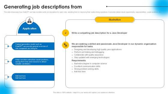 This slide showcases how ChatGPT can help recruiters write job description for open roles, assisting them in improving their routine hiring operations. It provides details about requirements, responsibilities, vacant positions, etc.If your project calls for a presentation, then Slidegeeks is your go to partner because we have professionally designed, easy to edit templates that are perfect for any presentation. After downloading, you can easily edit Generating Job Descriptions From AI Powered Recruitment Enhancing Ppt Example AI SS V and make the changes accordingly. You can rearrange slides or fill them with different images. Check out all the handy templates This slide showcases how ChatGPT can help recruiters write job description for open roles, assisting them in improving their routine hiring operations. It provides details about requirements, responsibilities, vacant positions, etc.
