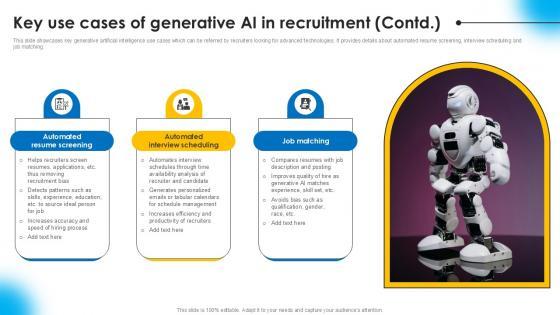 This slide showcases major use cases of generative artificial intelligence in recruitment, helping recruiters gain productive and efficient experience. It provides details about job descriptions, personalize outreach, candidate assessment, etc.The best PPT templates are a great way to save time, energy, and resources. Slidegeeks have 100 percent editable powerpoint slides making them incredibly versatile. With these quality presentation templates, you can create a captivating and memorable presentation by combining visually appealing slides and effectively communicating your message. Download Key Use Cases Of Generative AI Powered Recruitment Enhancing Ppt Example AI SS V from Slidegeeks and deliver a wonderful presentation. This slide showcases major use cases of generative artificial intelligence in recruitment, helping recruiters gain productive and efficient experience. It provides details about job descriptions, personalize outreach, candidate assessment, etc.