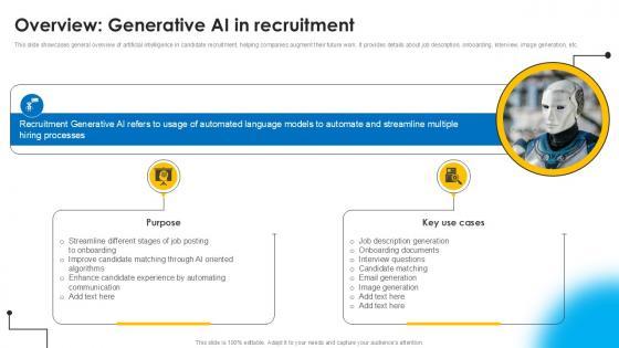 This slide showcases general overview of artificial intelligence in candidate recruitment, helping companies augment their future work. It provides details about job description, onboarding, interview, image generation, etc.Presenting this PowerPoint presentation, titled Overview Generative Ai In Recruitment AI Powered Recruitment Enhancing Ppt Slide AI SS V, with topics curated by our researchers after extensive research. This editable presentation is available for immediate download and provides attractive features when used. Download now and captivate your audience. Presenting this Overview Generative Ai In Recruitment AI Powered Recruitment Enhancing Ppt Slide AI SS V. Our researchers have carefully researched and created these slides with all aspects taken into consideration. This is a completely customizable Overview Generative Ai In Recruitment AI Powered Recruitment Enhancing Ppt Slide AI SS V that is available for immediate downloading. Download now and make an impact on your audience. Highlight the attractive features available with our PPTs. This slide showcases general overview of artificial intelligence in candidate recruitment, helping companies augment their future work. It provides details about job description, onboarding, interview, image generation, etc.