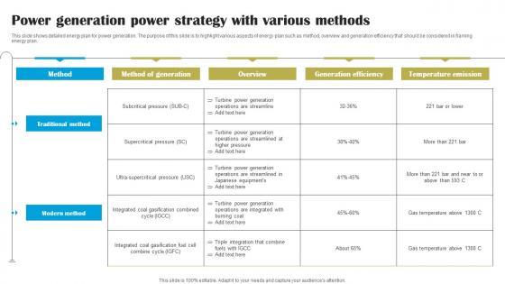 This slide shows detailed energy plan for power generation. The purpose of this slide is to highlight various aspects of energy plan such as method, overview and generation efficiency that should be considered in framing energy plan.Pitch your topic with ease and precision using this Power Generation Power Strategy With Various Methods Diagrams Pdf This layout presents information on Traditional Method, Ultra Supercritical Pressure, Temperature Above It is also available for immediate download and adjustment. So, changes can be made in the color, design, graphics or any other component to create a unique layout. This slide shows detailed energy plan for power generation. The purpose of this slide is to highlight various aspects of energy plan such as method, overview and generation efficiency that should be considered in framing energy plan.