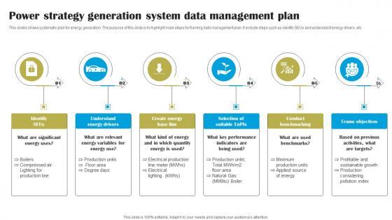 This slides shows systematic plan for energy generation. The purpose of this slide is to highlight main steps for framing data management plan. It include steps such as identify SEUs and understand energy drivers, etc.Showcasing this set of slides titled Power Strategy Generation System Data Management Plan Themes Pdf The topics addressed in these templates are Conduct Benchmarking, Frame Objectives, Electrical Production All the content presented in this PPT design is completely editable. Download it and make adjustments in color, background, font etc. as per your unique business setting. This slides shows systematic plan for energy generation. The purpose of this slide is to highlight main steps for framing data management plan. It include steps such as identify SEUs and understand energy drivers, etc.