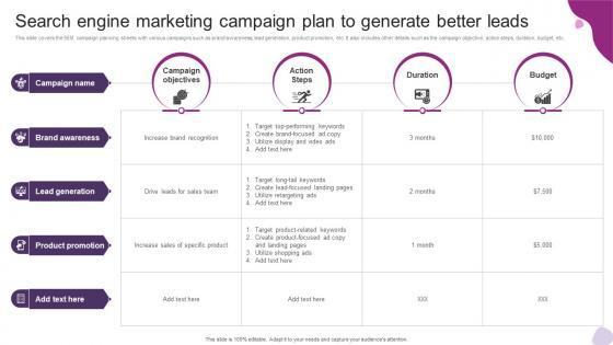 This slide covers the SEM campaign planning sheets with various campaigns such as brand awareness, lead generation, product promotion, etc. It also includes other details such as the campaign objective, action steps, duration, budget, etc. Formulating a presentation can take up a lot of effort and time, so the content and message should always be the primary focus. The visuals of the PowerPoint can enhance the presenters message, so our Search Engine Marketing Campaign Plan To Generate Powerful Marketing Techniques Strategy SS V was created to help save time. Instead of worrying about the design, the presenter can concentrate on the message while our designers work on creating the ideal templates for whatever situation is needed. Slidegeeks has experts for everything from amazing designs to valuable content, we have put everything into Search Engine Marketing Campaign Plan To Generate Powerful Marketing Techniques Strategy SS V. This slide covers the SEM campaign planning sheets with various campaigns such as brand awareness, lead generation, product promotion, etc. It also includes other details such as the campaign objective, action steps, duration, budget, etc.