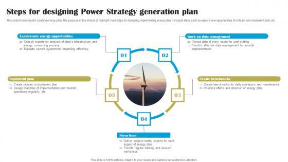 This slide show steps for creating energy plan. The purpose of this slide is to highlight main steps for designing implementing energy plan. It include steps such as explore new opportunities, form team and implement plan, etc.Pitch your topic with ease and precision using this Steps For Designing Power Strategy Generation Plan Pictures Pdf This layout presents information on Implement Plan, Form Team, Create Benchmarks It is also available for immediate download and adjustment. So, changes can be made in the color, design, graphics or any other component to create a unique layout. This slide show steps for creating energy plan. The purpose of this slide is to highlight main steps for designing implementing energy plan. It include steps such as explore new opportunities, form team and implement plan, etc.