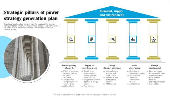 This slide shows five pillars of energy plan. The purpose of this slide is to highlight important pillars for creating and implementing energy plan. It include key pillars such as market price of energy source, supply and change management, etc.Showcasing this set of slides titled Strategic Pillars Of Power Strategy Generation Plan Guidelines Pdf The topics addressed in these templates are Efficiency Measures, State Governance, Change Management All the content presented in this PPT design is completely editable. Download it and make adjustments in color, background, font etc. as per your unique business setting. This slide shows five pillars of energy plan. The purpose of this slide is to highlight important pillars for creating and implementing energy plan. It include key pillars such as market price of energy source, supply and change management, etc.